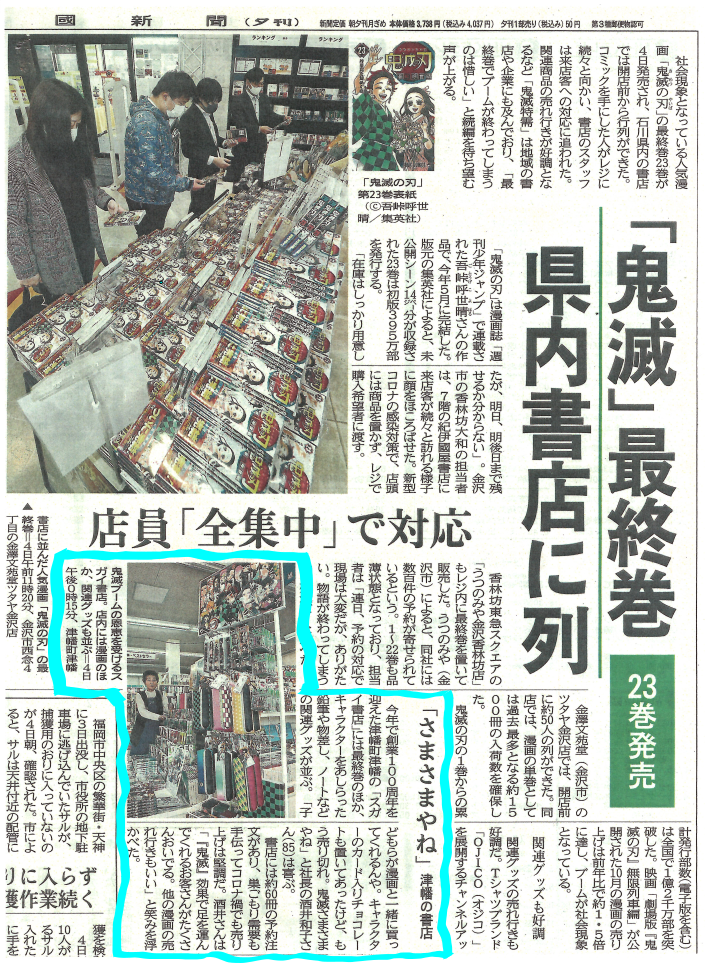 鬼滅の刃の最終巻が話題ということで当店社長が北國新聞社さんの取材を受けました。枠内が当店の記事です。